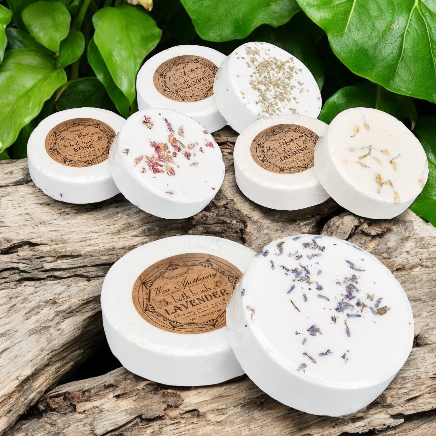 Botanical Bath Bomb Bundle includes 1 French Lavender, 1 Pure Rose, 1 Night-Blooming Jasmine & 1 Silver-Dollar Eucalyptus