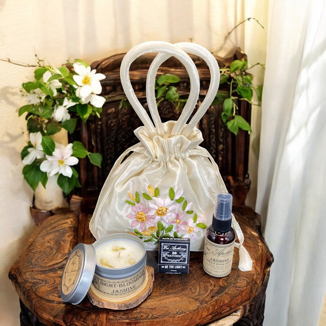 Presented in an elegant, hand-embroidered satin bag adorned with floral ribbon detailing, this set is both charming and sustainable.