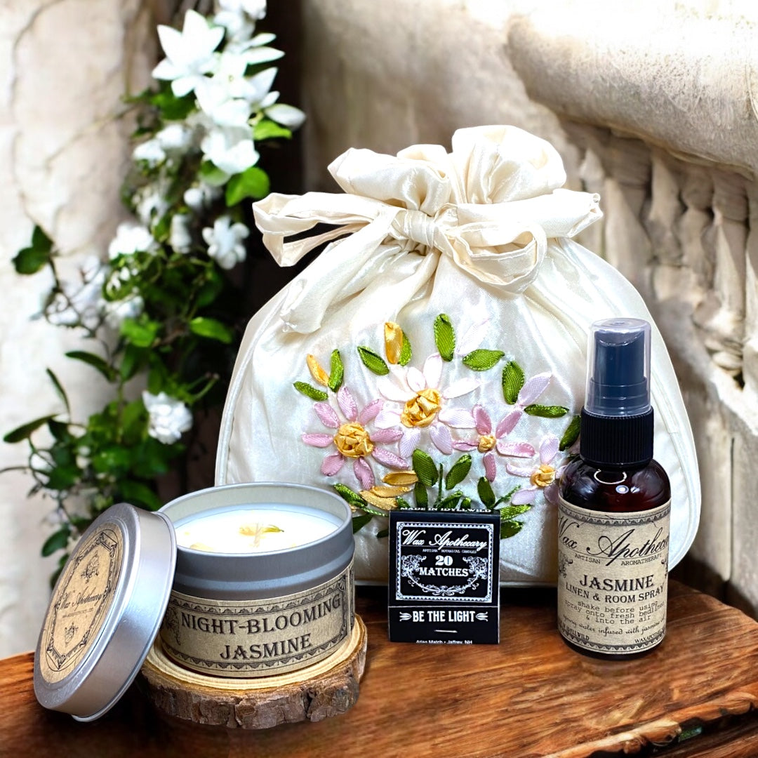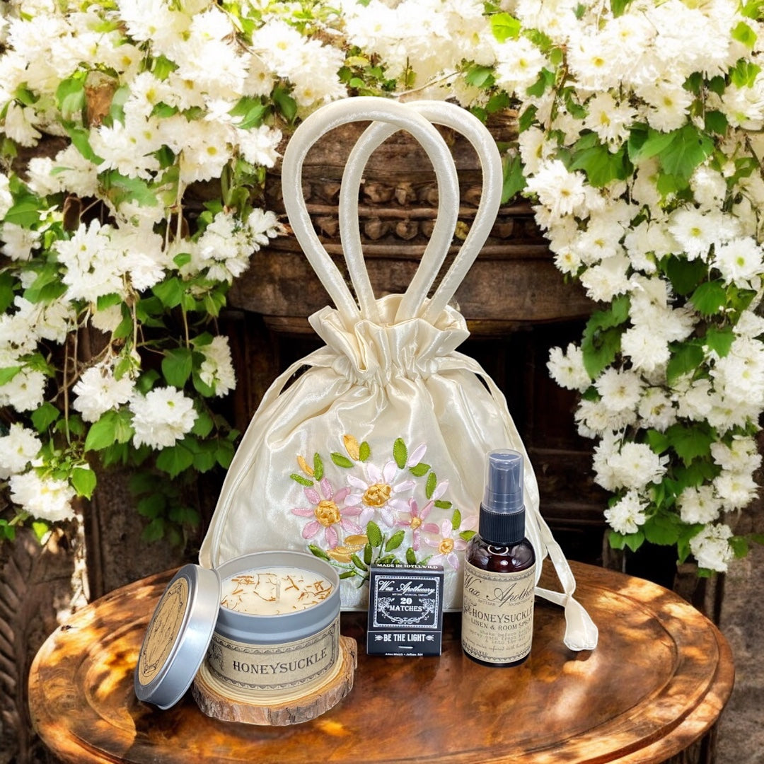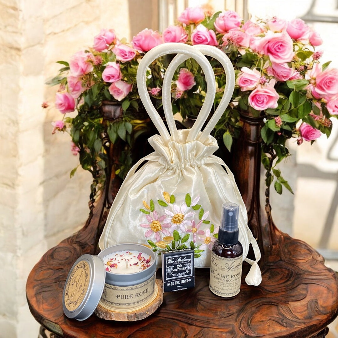 FLORAL AROMATHERAPY GIFT SET with Candle, Spray in Satin Bag